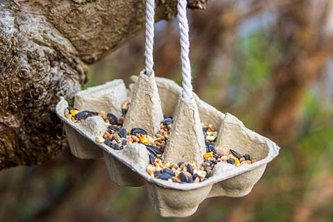 You could add other titbits too. Try uncooked and unsalted bacon rind, cooked and unsalted pasta, rice or potatoes, or raisins and sultanas (making sure dogs and cats can’t get to them). Keep an eye on the food and throw it away if it starts to go mouldy. You could always make another egg box buffet!