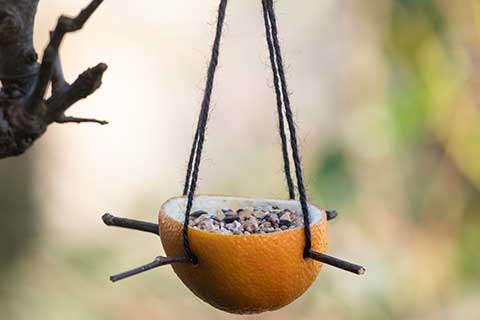 These eco bird feeders use all natural or compostable materials and they're cheap and easy to make. Birds like robins, finches, tits and house sparrows will love pecking at the fruit and seeds. Have a go at making one or all of the three easy designs, then hang them up in a sheltered space. You don't need a garden - they'll work just as well on a balcony, hung on a sheltered house wall or by a window, or added to allotments. Try to hang them high enough that cats and dogs can't get to them. And don't forget to leave out a dish of fresh, clean water too!