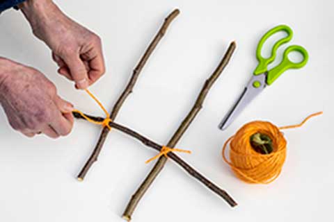 3. Start with the four shorter sticks. Lay one at a right angle to another. Where they cross, wind a length of string round and round as tightly as you can, and tie a knot. Trim the ends of the knot. Do the same with the other sticks to make a square with sticking out ends (for the birds to perch on).
