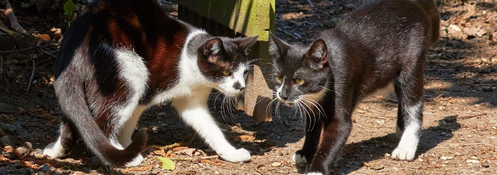 After a period of positive visual contact, allow the cats to physically interact for a short time, in a restricted space (such as one room) and under your supervision. Use special treats and toys. Interact with the cats to stop them from staring at one another or to disperse any tension.