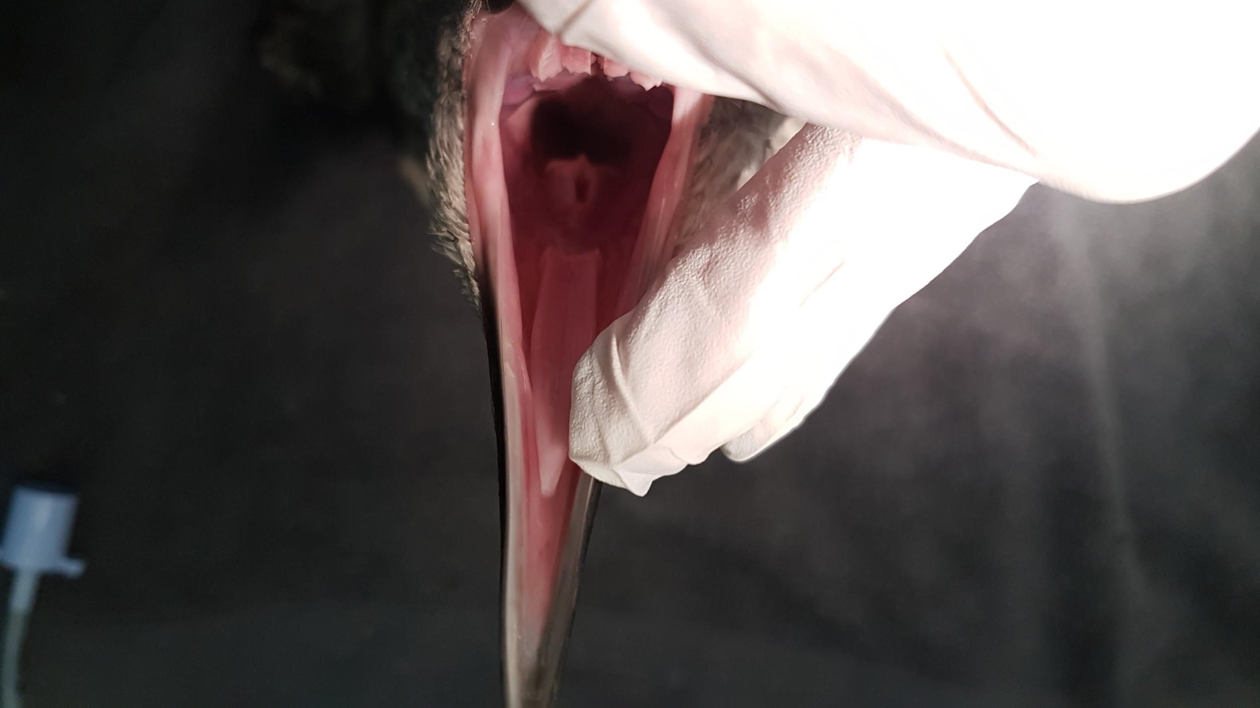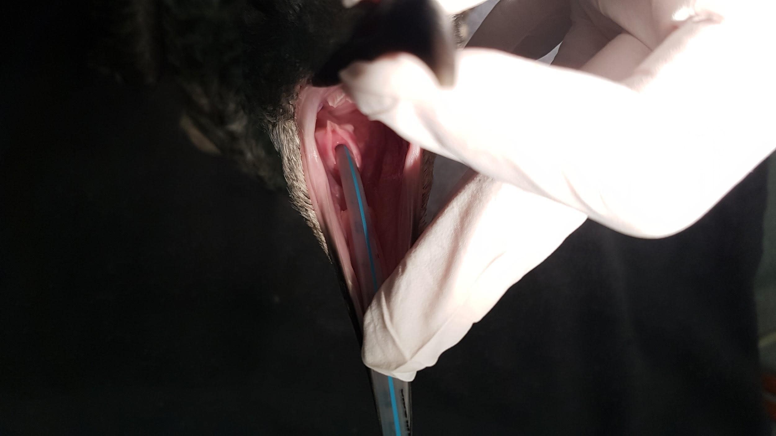 (3) Once the bird is anaesthetised (there should be no response when you pinch a toe), turn off the oxygen and the vaporiser and flush the circuit before removing the mask. The bird should then be intubated. Open the beak fully and visualise the glottis at the base of the tongue. Pulling the tongue forward can aid visualisation.