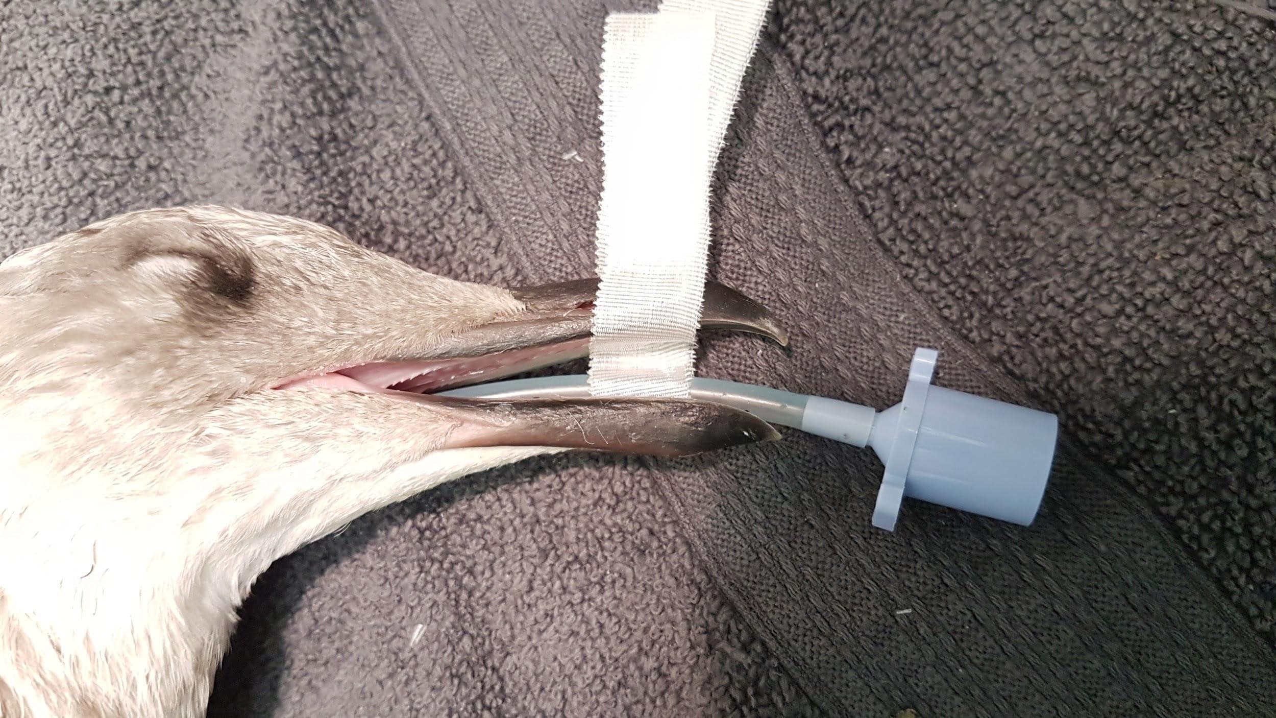 (5) Secure the tube to the beak using some durapore tape. Ensure the tape is securely attached to both the tube and the beak. Place a small drop of eye lube into each eye.