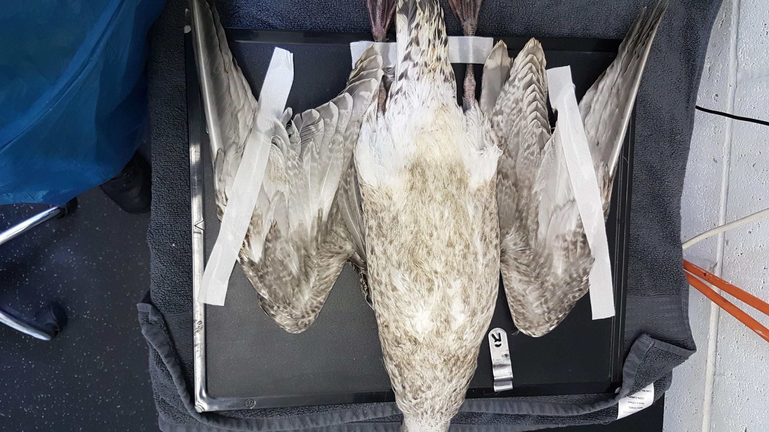 (3) Secure the wings to the plate using micropore or durapore tape across the primary feathers. Ensure that the two wings are extended the same distance from the body.