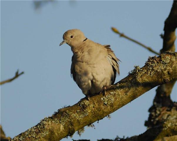 Fledgling collared doves lack the black collar seen in the adult.