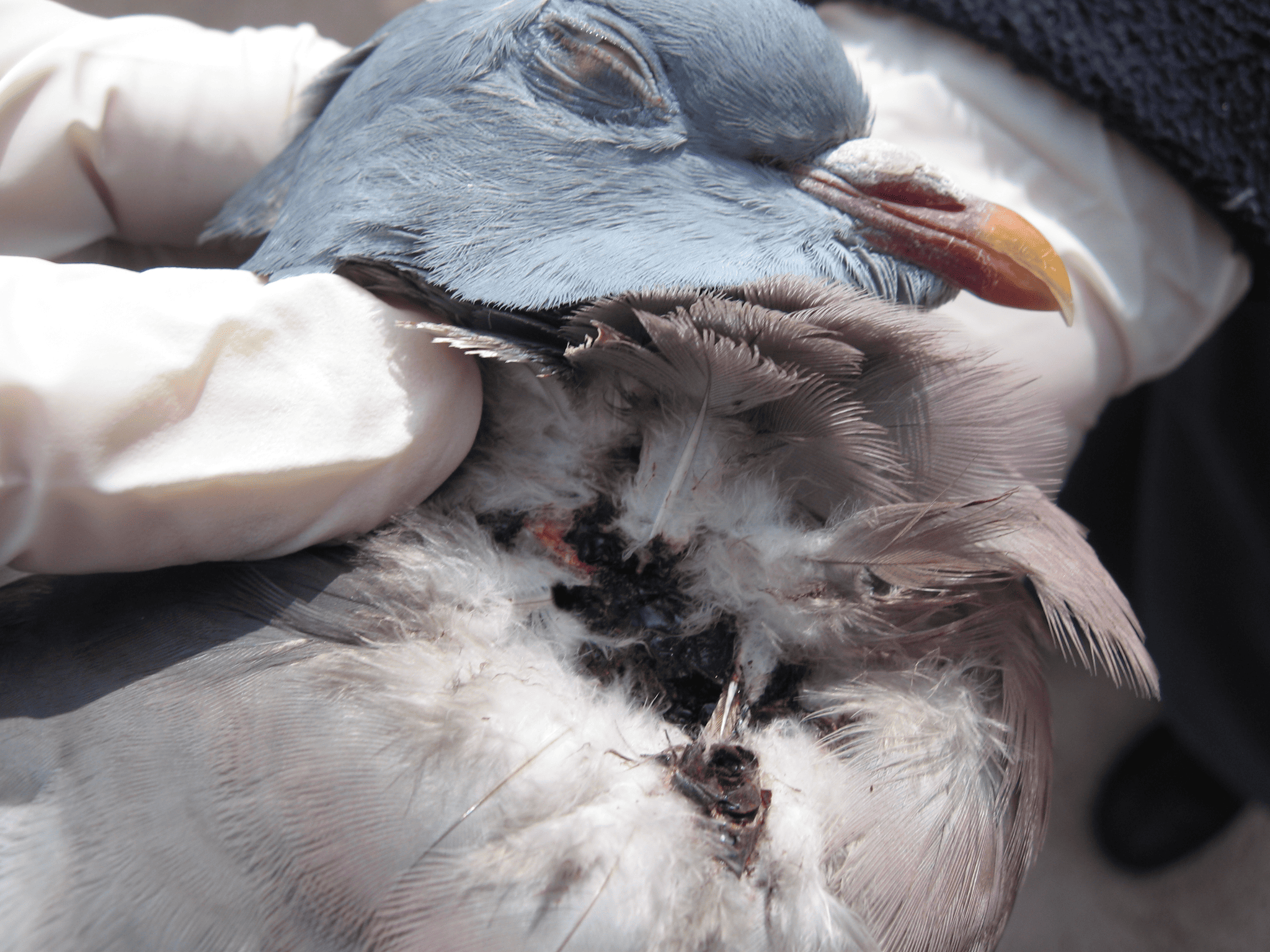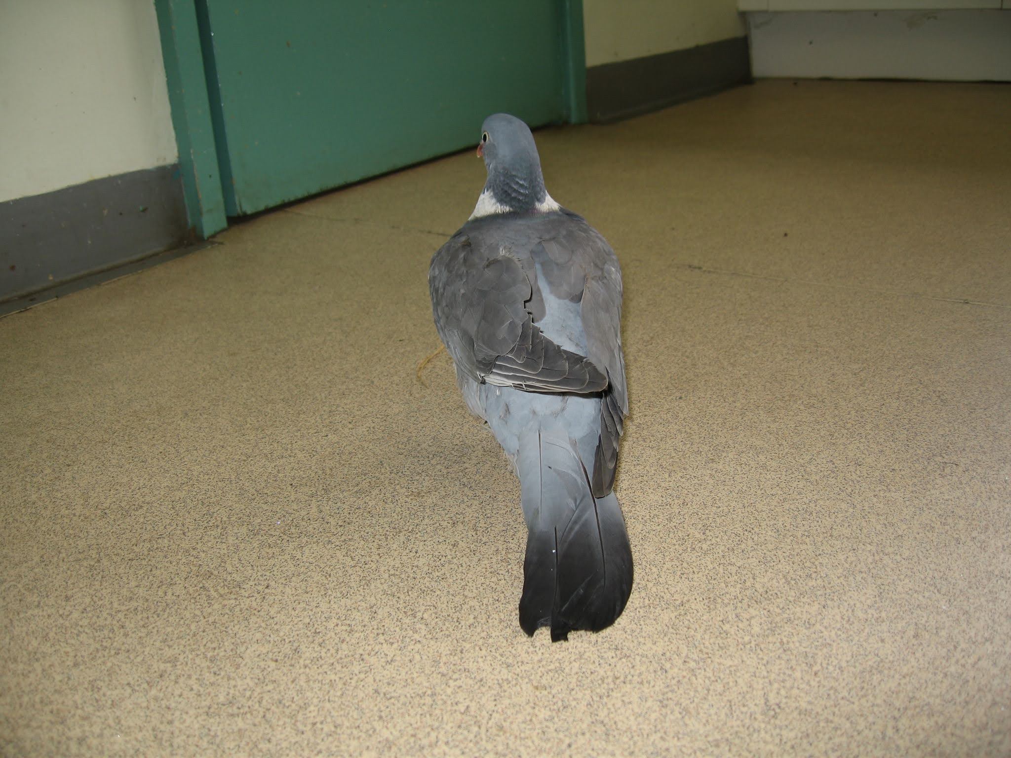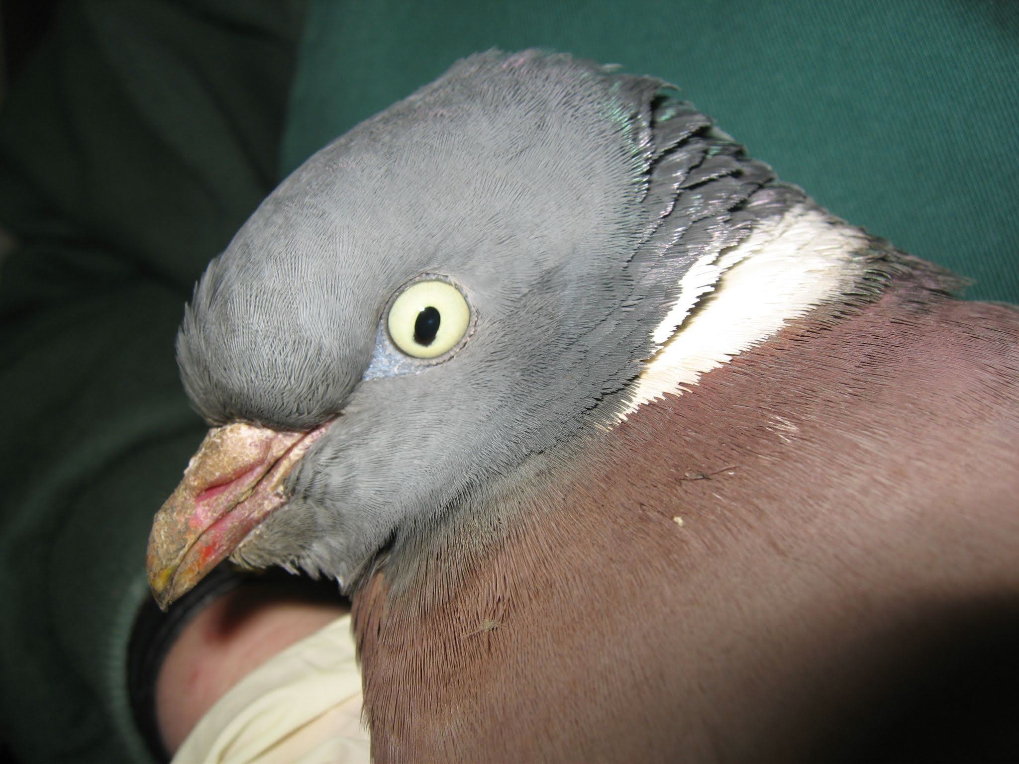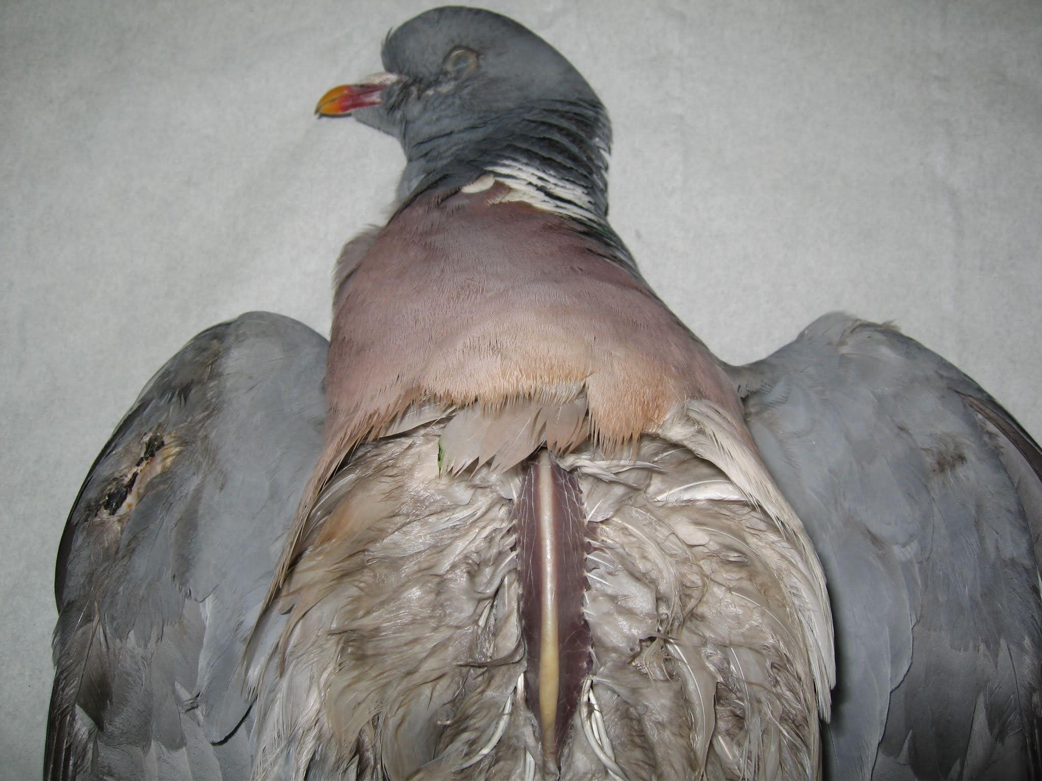 Regardless of the cause of trauma, feather loss in wood pigeons is very common, causing them to present as ‘grounded.’ They ‘drop’ feathers easily, which is apparent on handling. (For this reason, vinyl examination gloves should be worn when handling, rather than latex.)