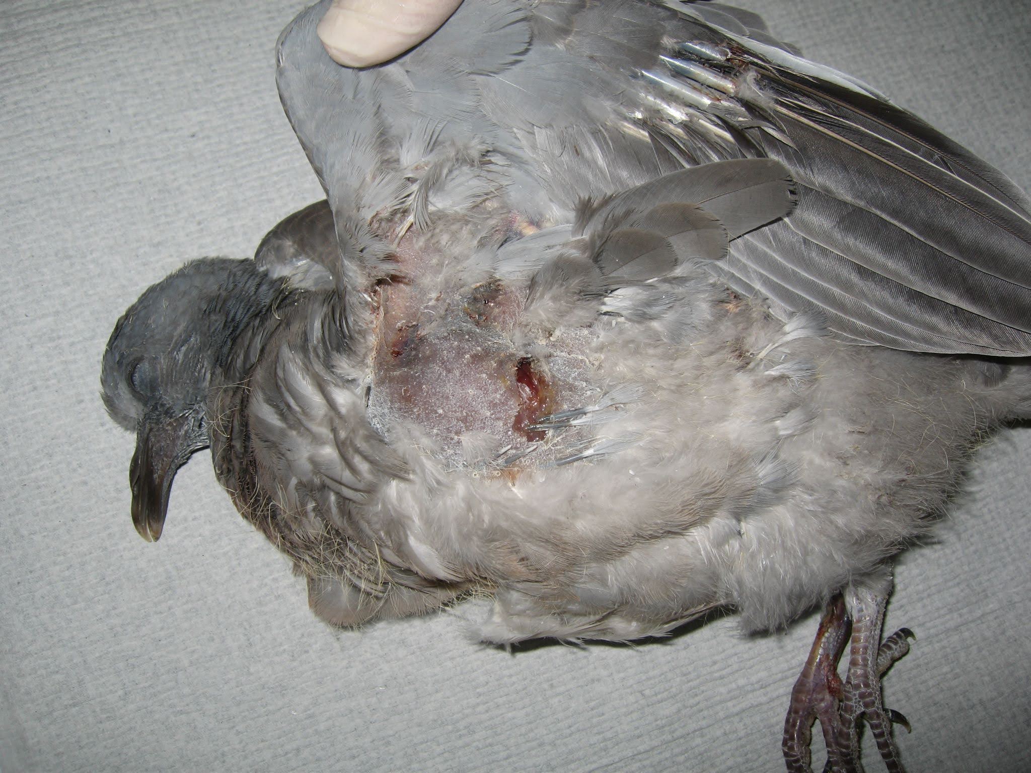 The prognosis is poor, as the wounds are often extensive, with muscle involvement and damage to underlying tissues, such as the crop. The necessity for repeated handling and crop-tubing should be considered in a fledgling bird.