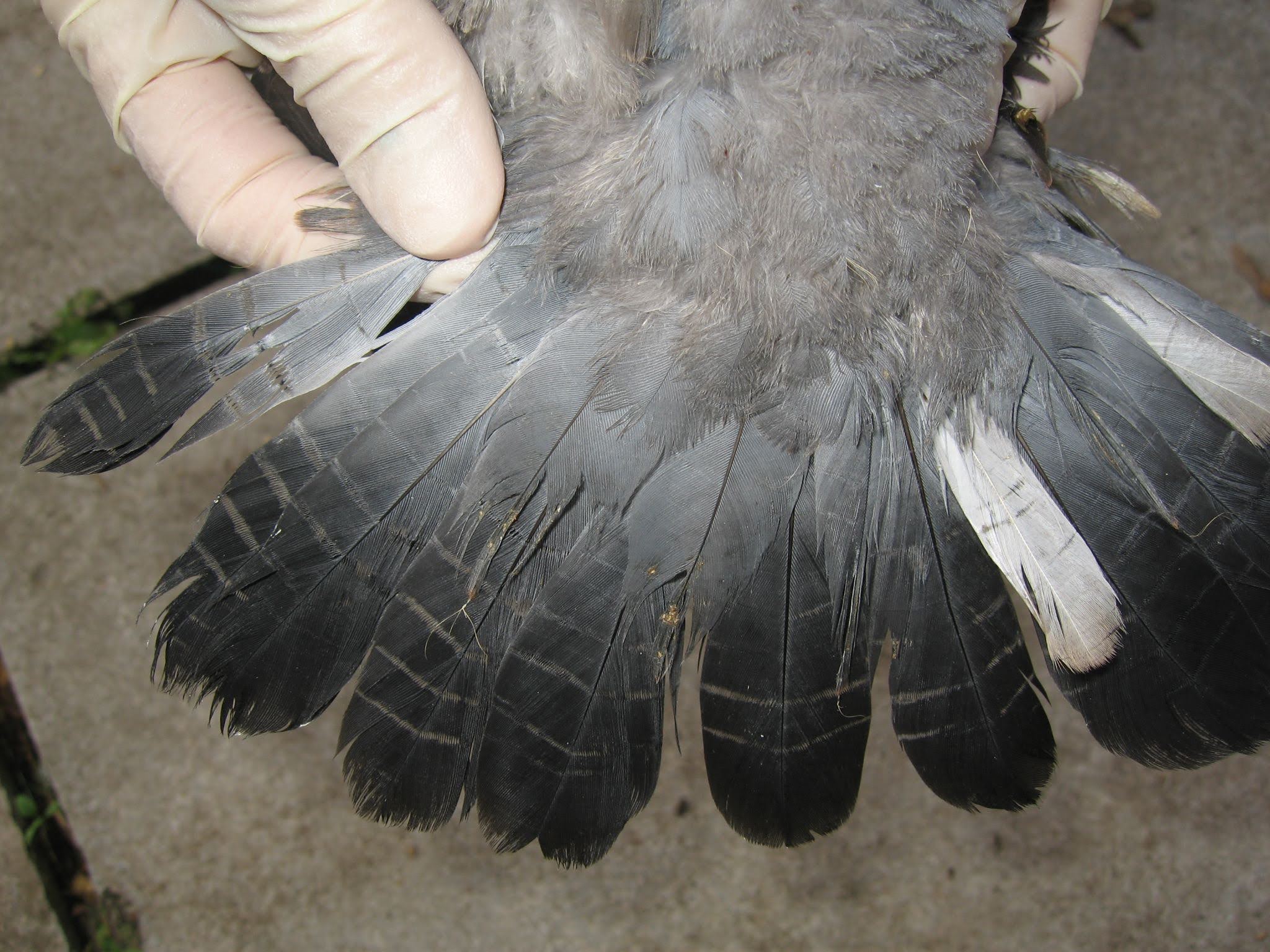 It is not uncommon to find feral pigeons which have had their flight feathers cut with scissors (all of the same length with a neat edge).