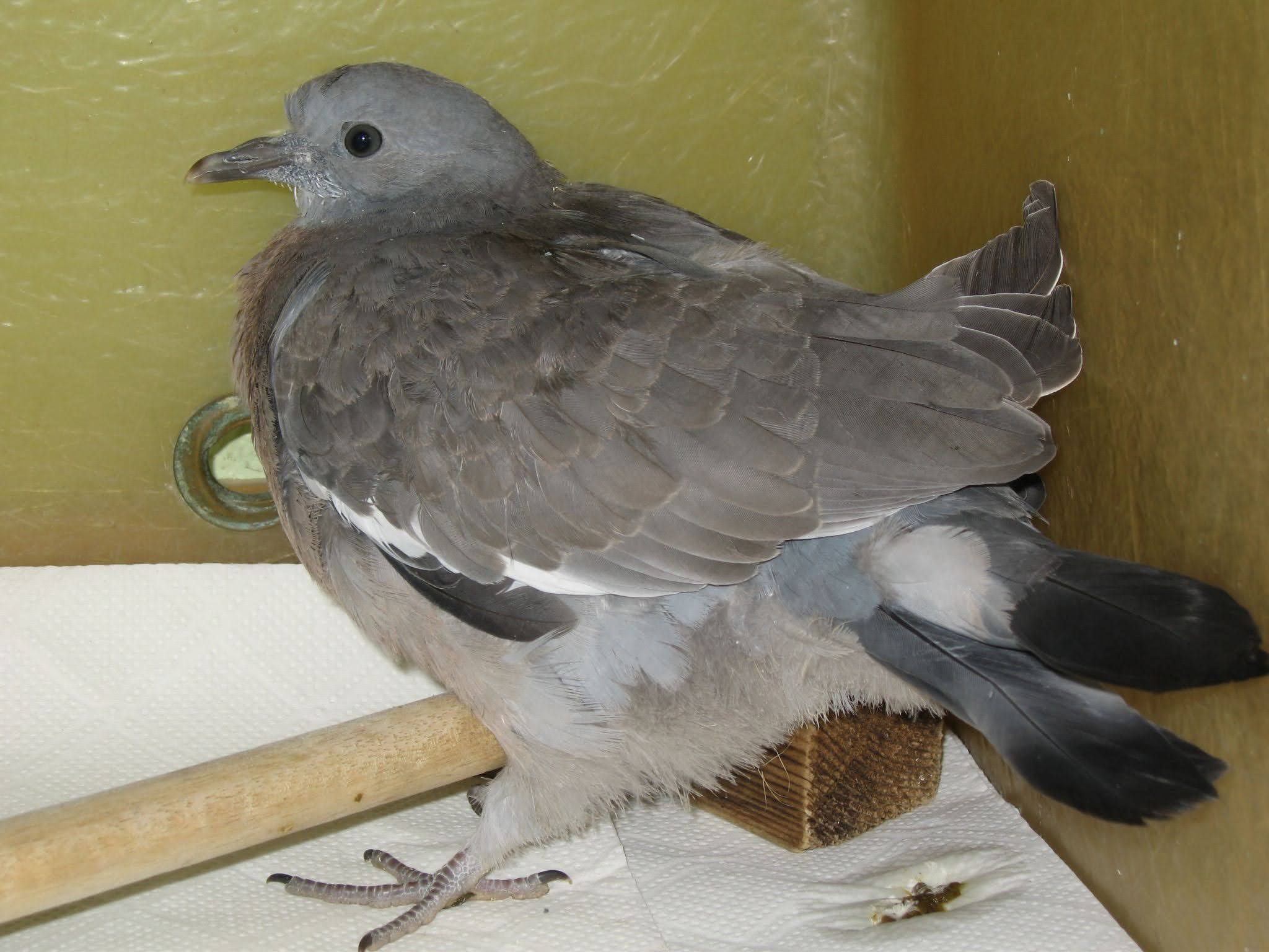 Fledglings cope better with captivity than adult wood pigeons. However, they are still more fractious than feral pigeons, and are prone to cage trauma, including flight feather damage.