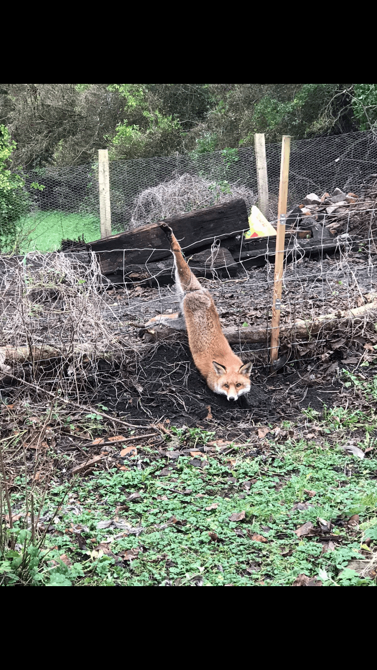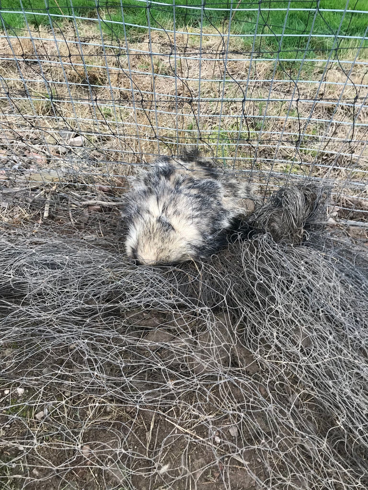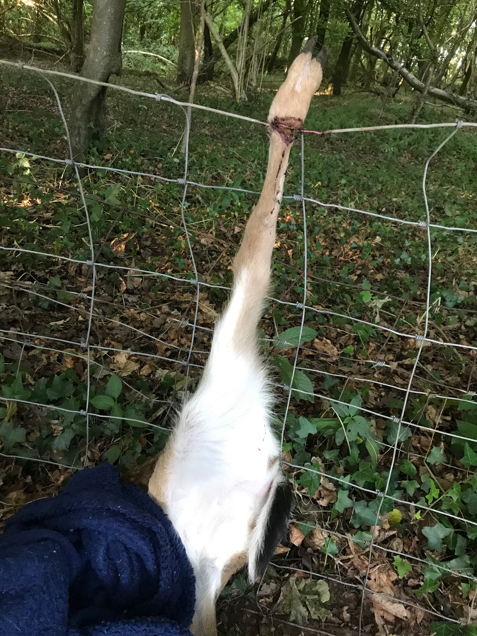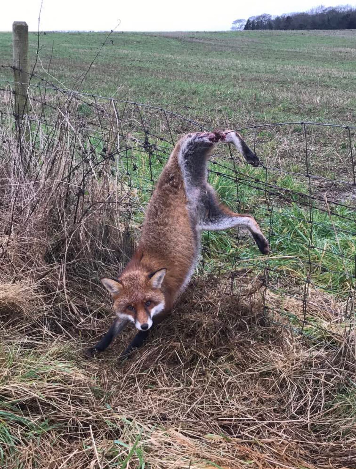 Typical presentation of a fox in fencing for us - jumped over and get a hind leg caught up, now left hanging. Like we get with the deer.