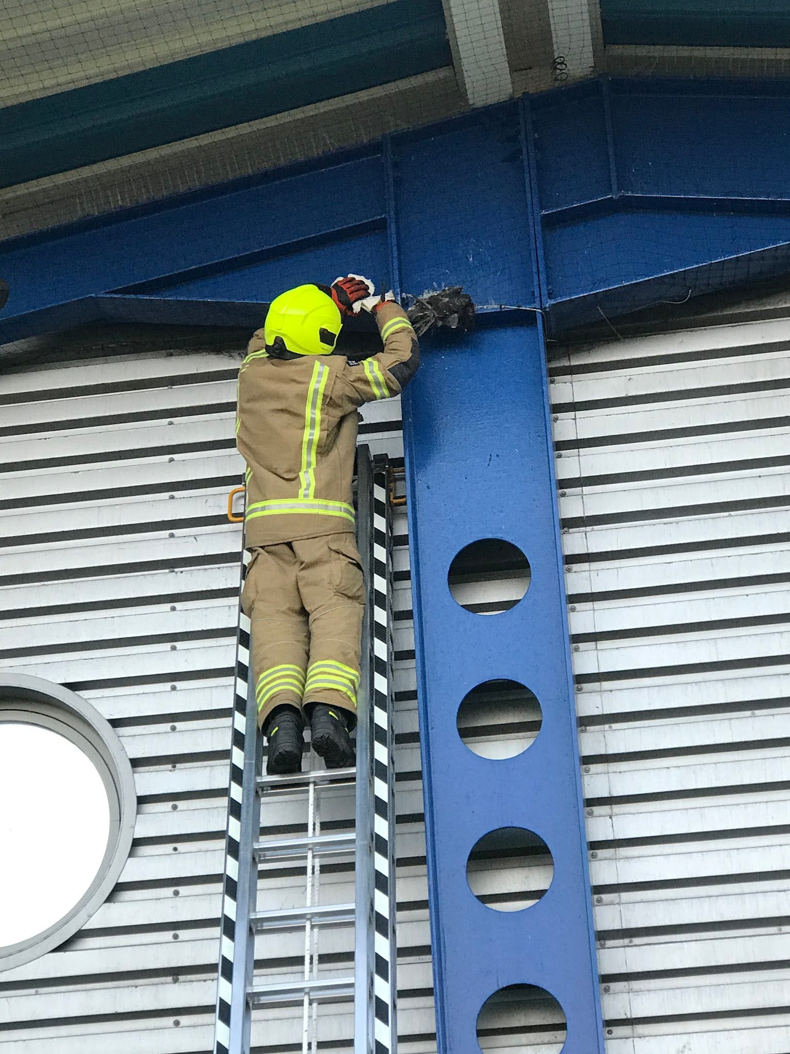 When asking F & R for assistance give the person going up the ladder cable ties so that they can close up any holes they may need to make. Not always possible depending on situation, but can help prevent other birds gaining access in.