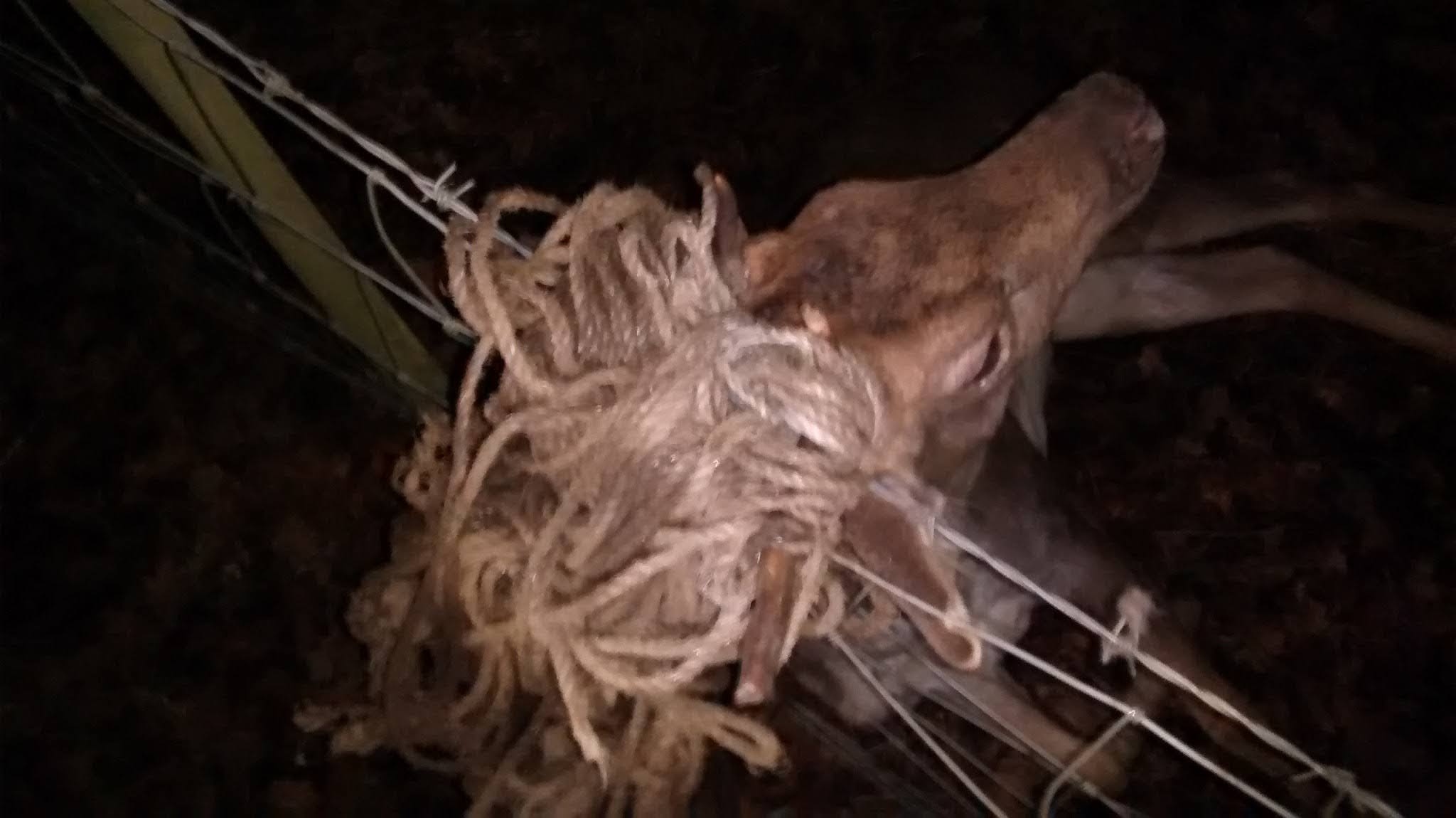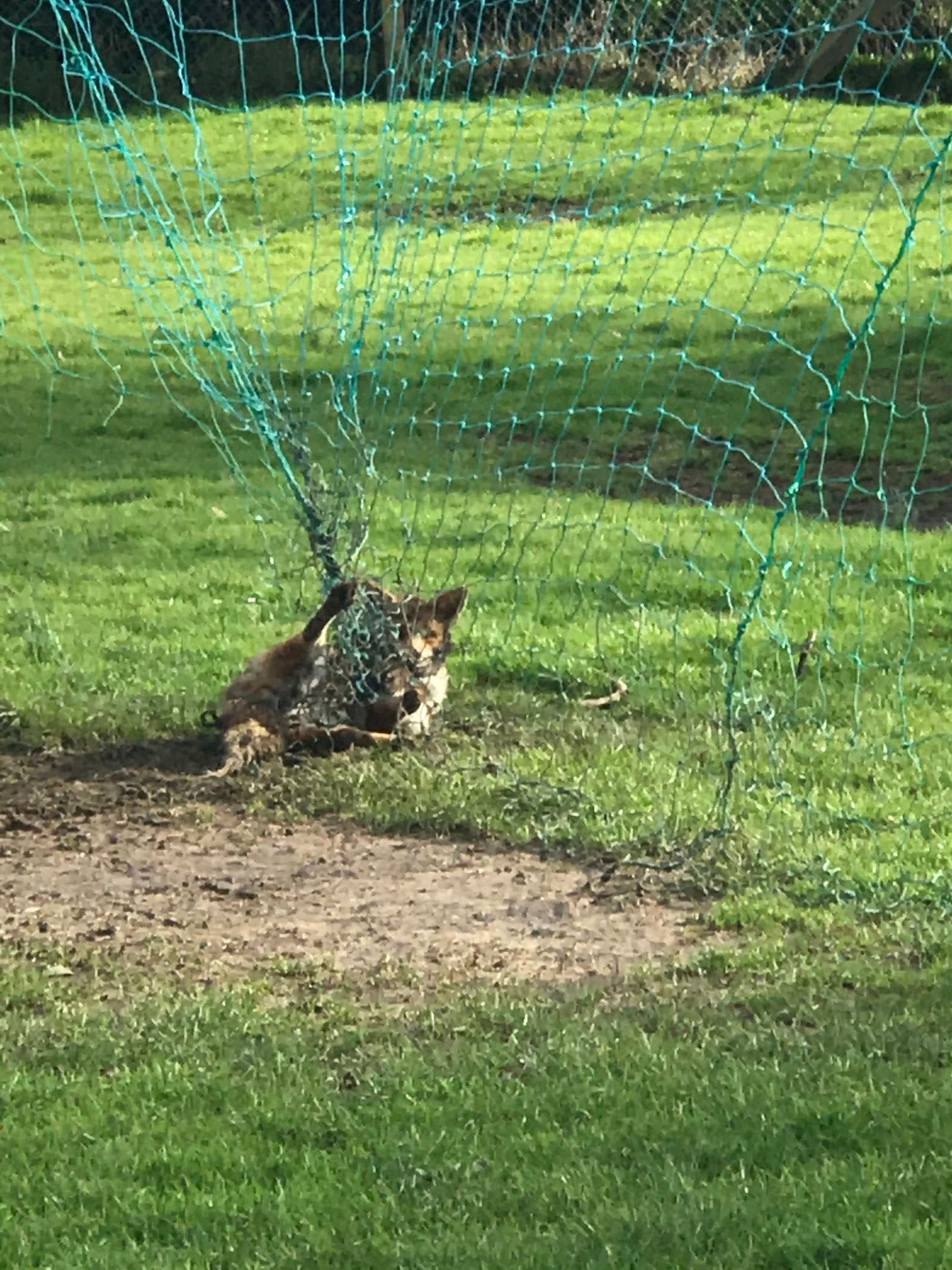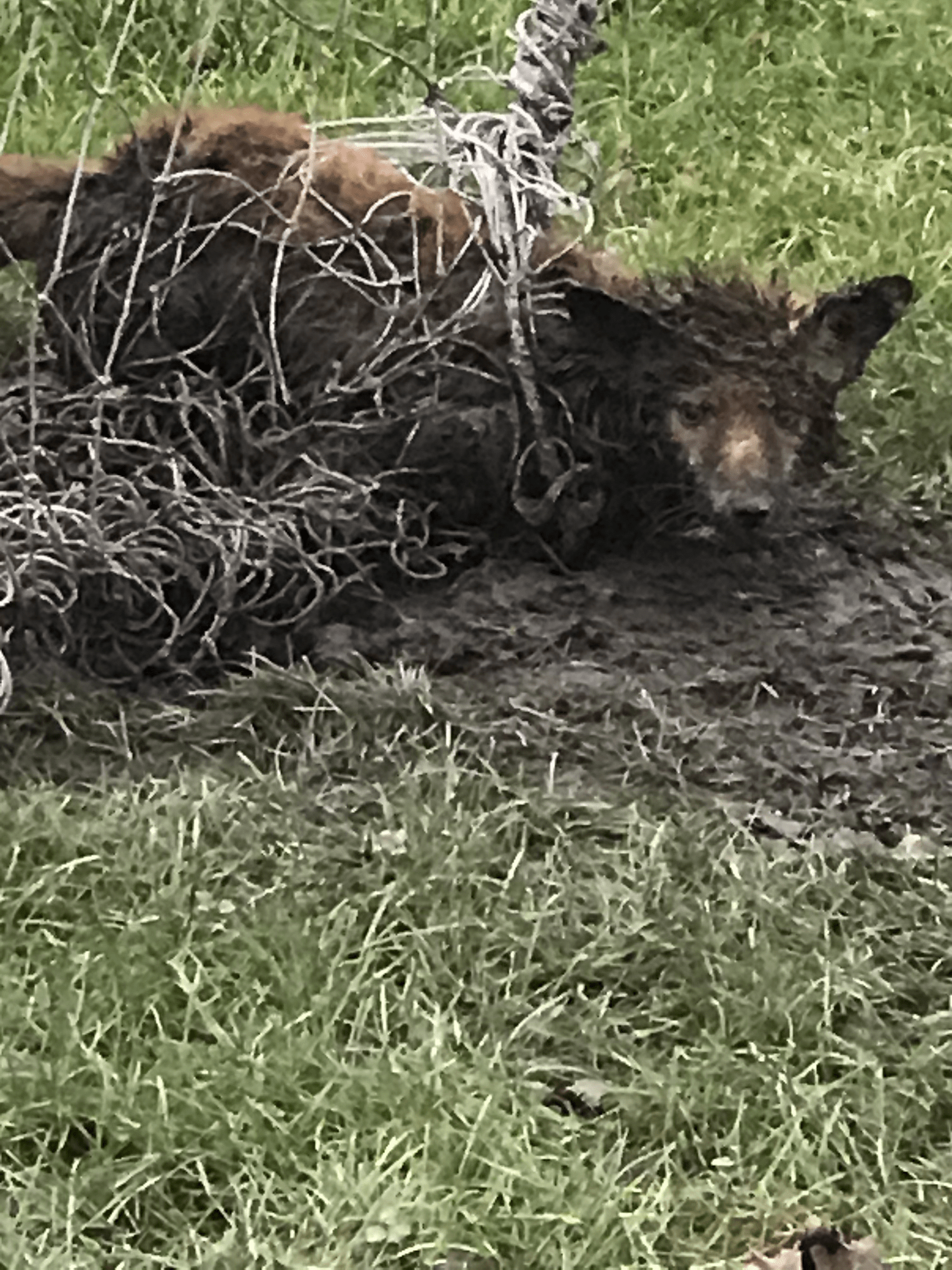 - Deer, Foxes or Badgers caught in fencing (wire/barbed wire or electric fencing tape) or sports netting