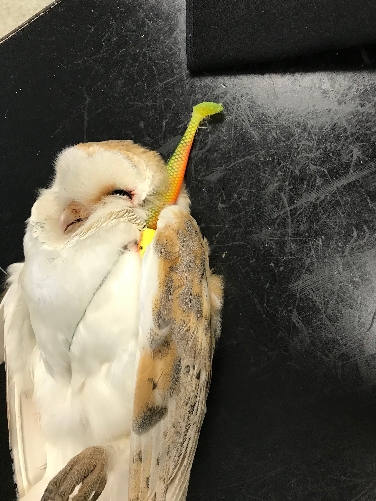 Middle pic - Adult Barn owl - caught in fishing line and hook and tackle.