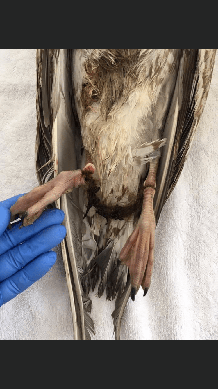 - Birds that have had netting tightly wrapped around legs and wings, especially the wing joints - think PRESSURE NECROSIS.